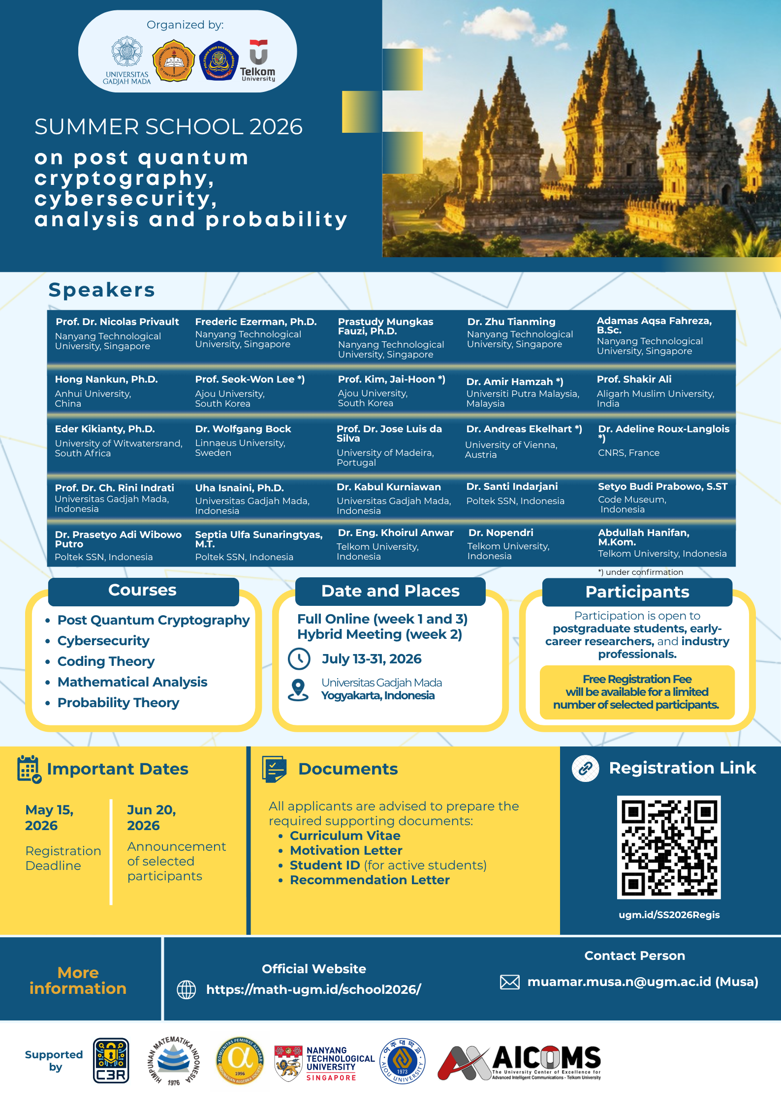 This program is a continuation of the summer school initiatives previously organized in 2023 and CIMPA School 2025, which demonstrated the strong relevance of intensive academic training in cryptography and cybersecurity for strengthening human resource capacity. Building on those earlier programs, the current activity is designed not only to sustain the momentum of collaboration and knowledge transfer that has already been established, but also to expand its impact through a more focused integration of mathematical foundations, cybersecurity challenges, and international partnership support.